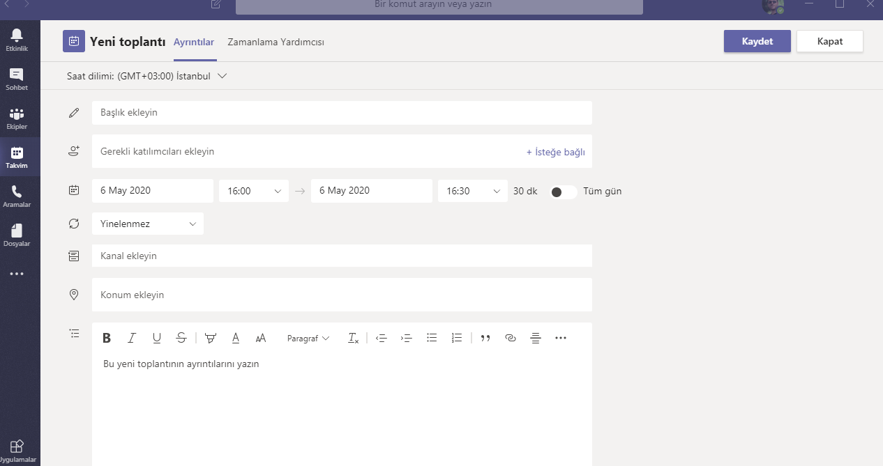 Katılımcıları ekledikten sonra toplantının başlangıç ve bitiş saat aralığı girilir. Düzenli bir toplantı ise hemen altında yineleme zamanı girilir. Örneğin her hafta gibi. Kanal ve konum kısmını boş geçebilirsiniz. Toplantı ile ilgili ayrıca bir not göndermek isterseniz maille beraber onu da en alt kısımda yazabilirsiniz .Toplantıyı planladıktan sonra sağ üstte gönder butonuna bastığınızda toplantı takviminize işlenir hem teams hem de outlookta ve katılımcılara davetiye maili gitmiş olur.