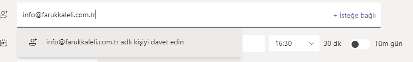 Gerekli katılımcılar bölümünde toplantıyı düzenleyen kişi, katılımcıların mail adreslerini yazmak suretiyle katılımcıları ekleyebilir. Etkinlik oluşturulduğunda katılımcılara toplantıya katılabilmeleri için bir davetiye maili gidecektir , mailde toplantı için link oluyor ve katılımcı linke tıkladığında kolayca toplantıya dahil oluyor.